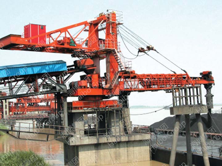 墩柱式装船机装载作业方式为定机移船,整机可绕旋转中心旋转。该机型的特点为后方为定点受料,简化了工艺布置,节省了码头投资成本。